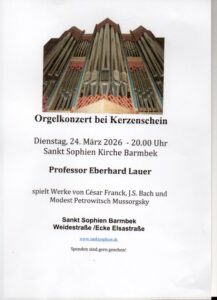 Liebe Interesseierte an schöner Orgelmusik. Esist wieder soweit: Ausnahmsweise an einem Dienstag findet ein Orgelkonzert ei Kerzenschein in unserer schönen Kirche statt. Der sehr bekannte Organist, Professor Eberhard Lauer, spielt Werke von César Franck, J.S. Bach und Modest Mussorksky. Professor Lauer ist emeretierter Kirchenmusikdirektor des Mariendoms in Hamburg. Das Konzert dauert ca. 60 Minuten. Der …